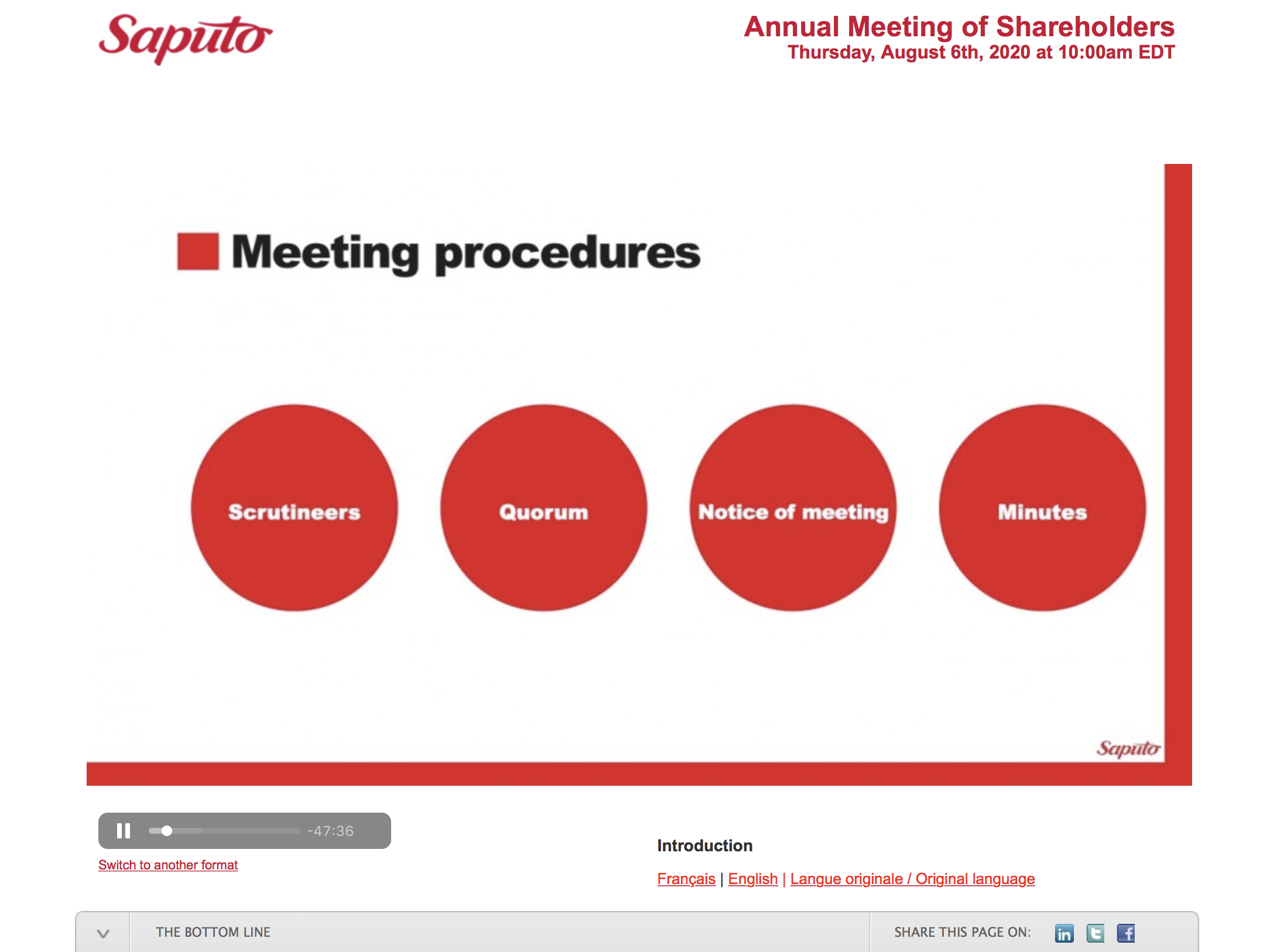 gowebcasting is a partner with many corporations as they broadcast professional audio or video AGMs (while the chairman, directors, CEO, CFO, corporate secretary all or mostly work from home). This is accomplished using various video and audio conferencing technologies, while working closely with AV and conference call providers, virtual voting platforms, transfer agents, etc. to satisfy regulatory and legal requirements.